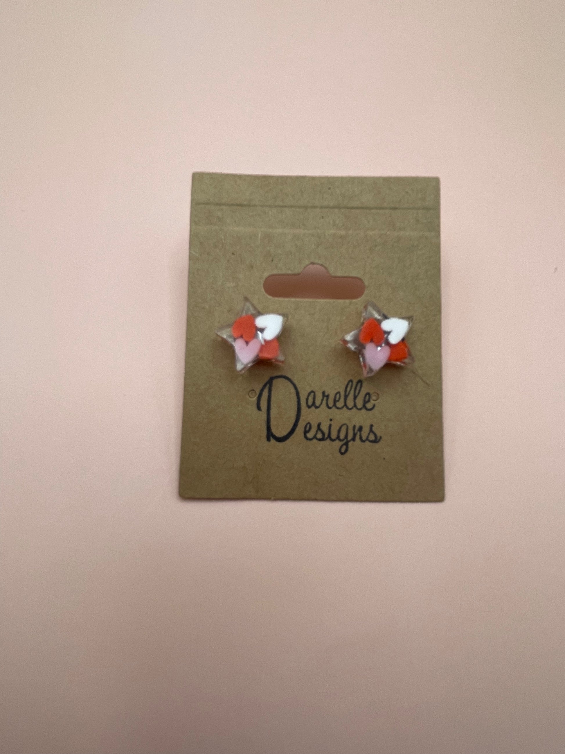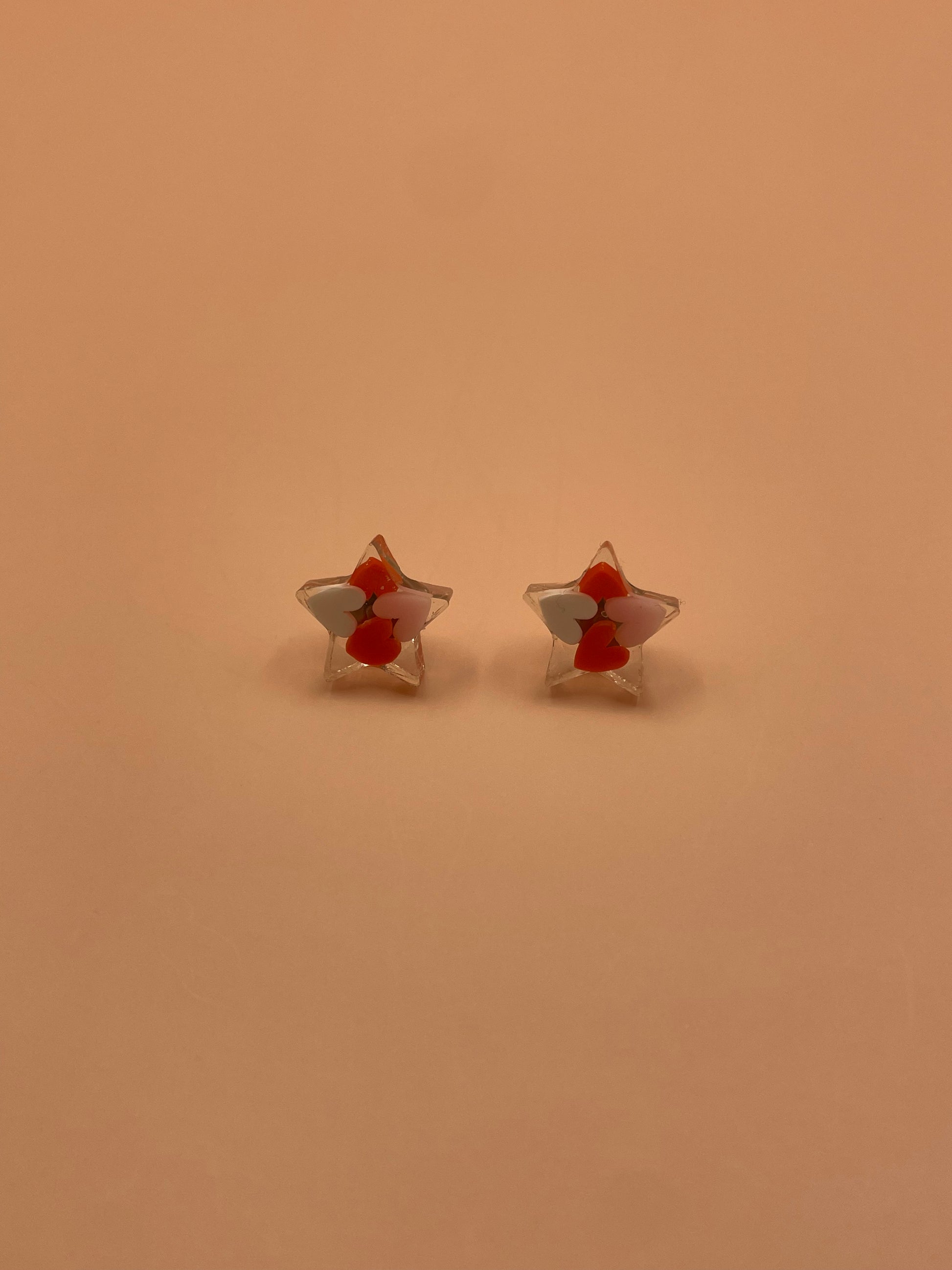 Star shaped stud earrings with red, white and pink clay heart pieces embedded into uv resin. This is a small batch product so colors may differ slightly. All earrings are made with nickel free hooks and posts. Every item is lovingly handcrafted in Brooklyn, New York.